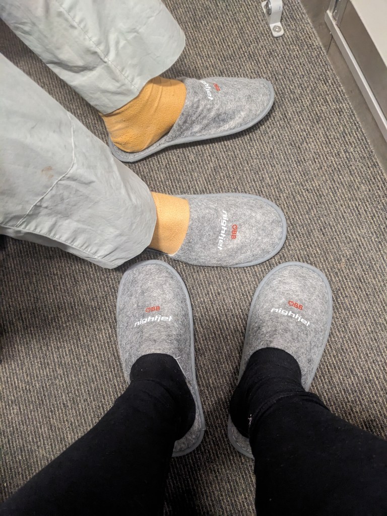 We are now on the NightJet in a cubby hole that is bed for the night. Rob, being a proper husband, has kindly taken the top bunk. I was so excited by having a toilet but can’t use it as it has run out of water (why this is so when the train started at Amsterdam?) but I will be consoled tomorrow by a bit of a refund. Tonight, not so much, as I pad along two carriages to the nearest toilet. But at least they have provided us with slippers that I might just have to find room in my luggage for.