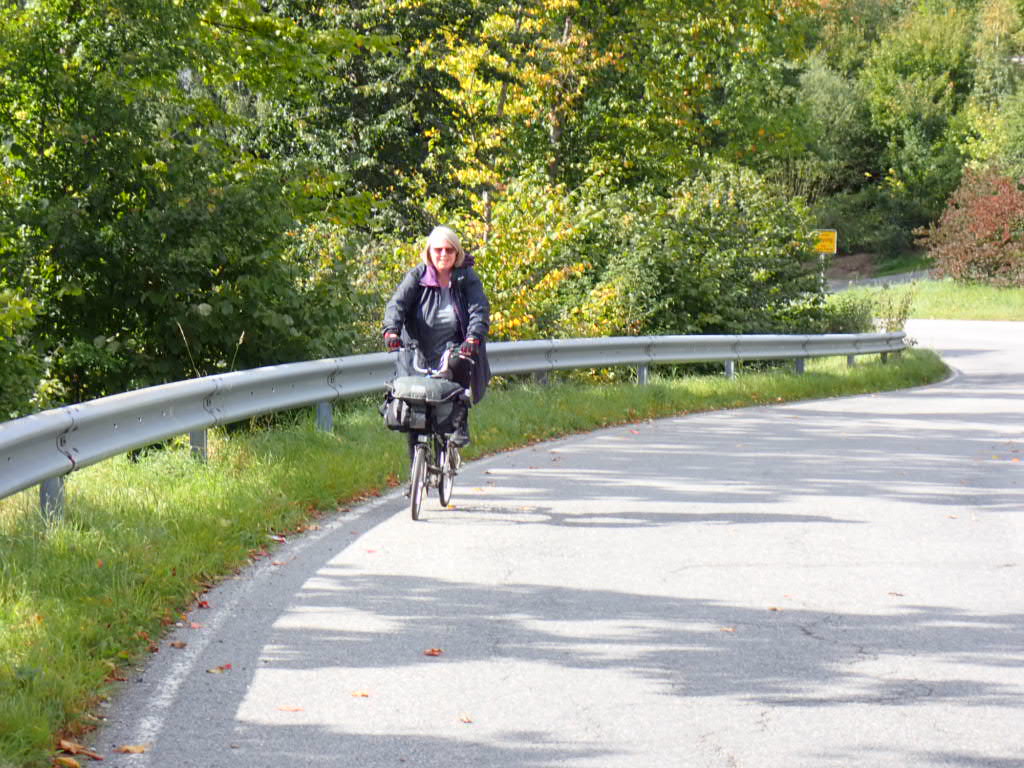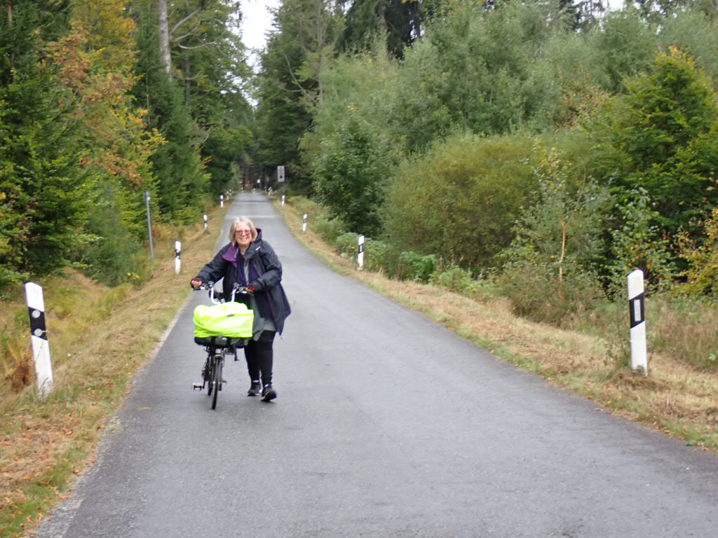 After an hour bus ride to Freyung, the ‘only way is up’ from now on – over 1000m climbed on our little Brompton fold-up bikes – the biggest amount of climbing we have ever done in a day ever. A very long slow climb. But I have probably walked for longer than I have cycled today as the air got thin and cold as we climbed and Rob was very patient as I puffed along behind.