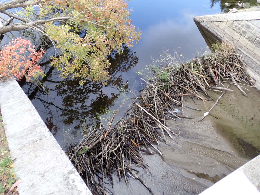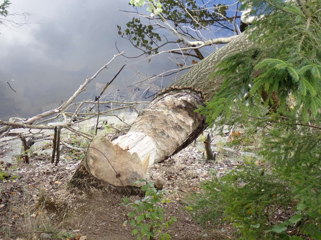 Our lunch stop was standing up on a bridge across a little part of the reservoir, where beavers had been at work – the fallen tree in this photo had been brought down by beavers gnawing right through the trunk- with Austria in the background.