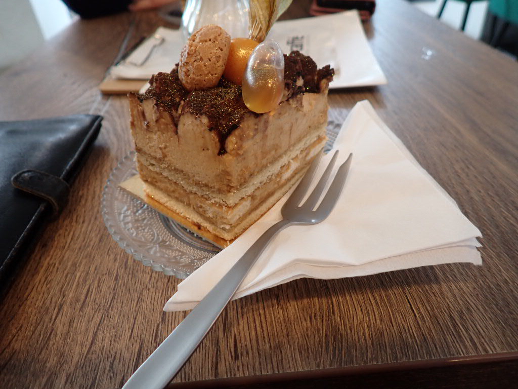 Having had no lunch and feeling cold and a little hard done by, I determined that a cup of tea and something ridiculous was in order to celebrate our last day in the Czech Republic, when we arrived in Ceske Budejovice. This absolutely fitted the bill. Any complaints from the keeper of the purse were easily squashed by my reasoning that I had not had one beer the whole trip (no hardship there). This hazelnut tiramisu had little plastic hearts that acted as a pipette that, when squeezed, doused the cake with alcohol. They have been smuggled into my luggage to make it home.