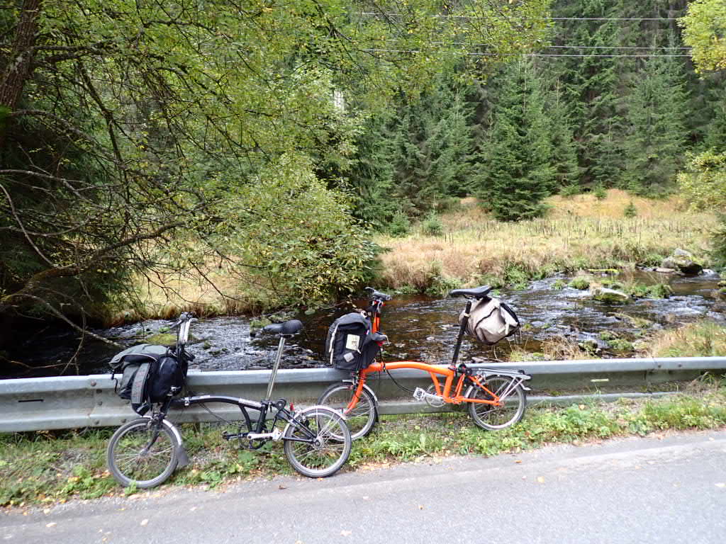 If what goes up, must come down then in cycling terms what comes down, then nearly always must go up. When I planned the trip to follow a river, I was aware that rivers do flow down and that generally we would be going more down than up. The first 7km from Kvilda to Borova Lada really were down – such a reward from the long climb of the day before. We hit our highest ever speed on Bromptons at at least 35mph. It was within the speed limit so no worries. But with the downs came the cold. We left Kvilda with the temperature lurking around 4 degrees C. Throughout the day it was gloves and hat after I had removed the thermal vest I started out with. So the downhill stretches were welcome but often a sign that we would have to make back up most of the height around the next corner, but then again a bit of climbing put back the warmth into my freezing fingers.